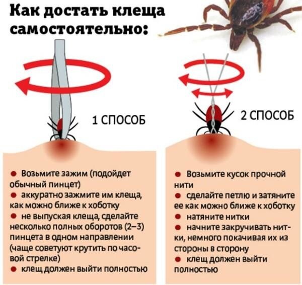 Лучше всего за этим обратиться к врачу, но если в ближайшее время к нему попасть не реально, то придется делать это самостоятельно. Доставать клеща нужно без промедлений, чем меньше времени пройдет до его извлечения, тем меньше шансов заразиться. Делать это нужно аккуратно, вращательными движениями, не в коем случае не выдирать, так можно оторвать ему голову, мало того, что ранка воспалит